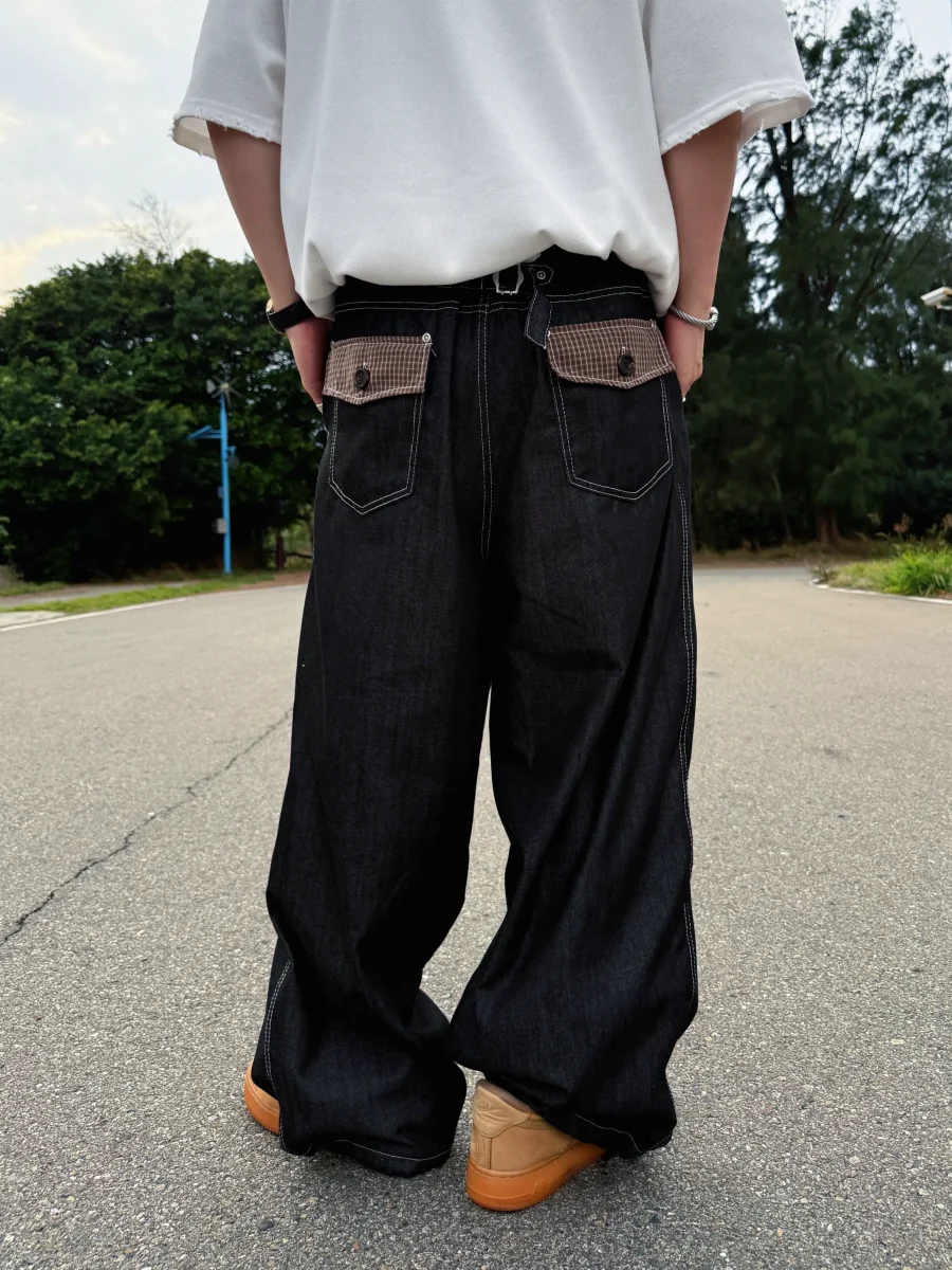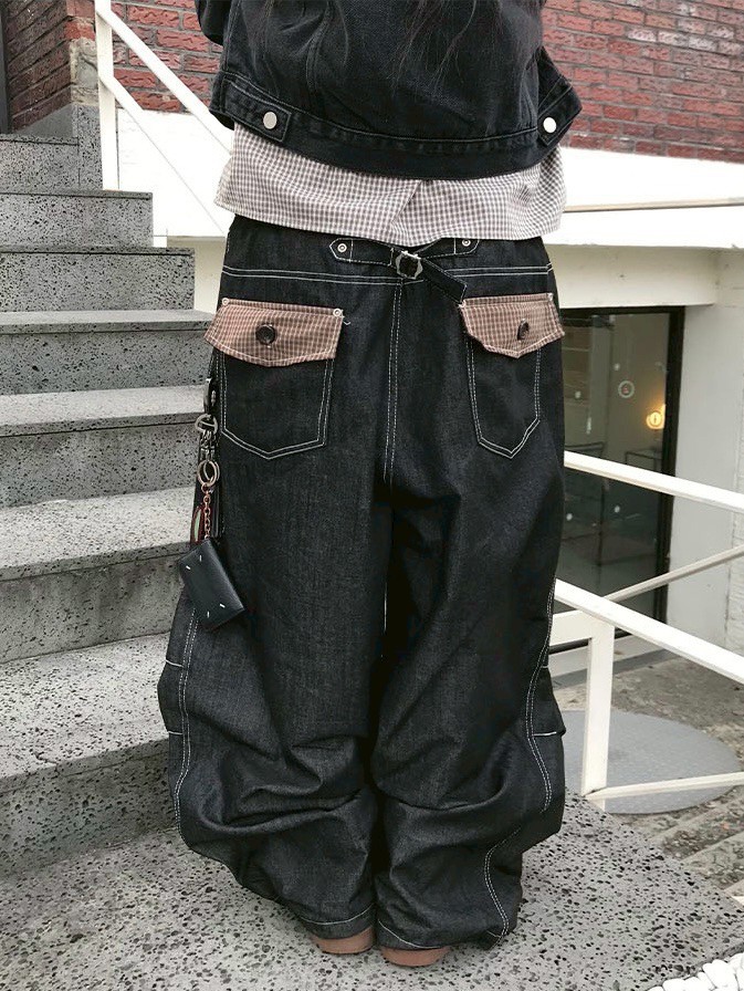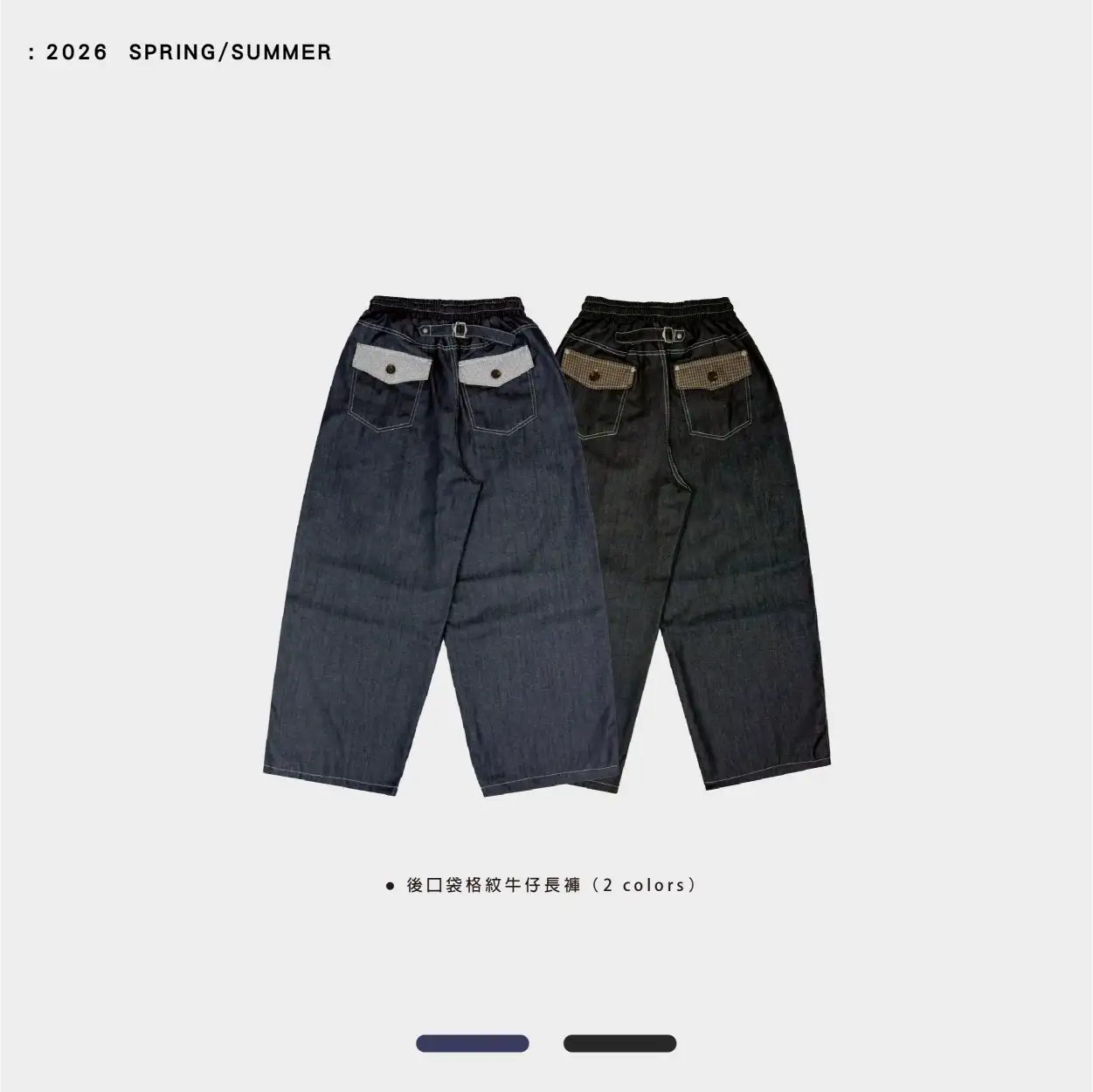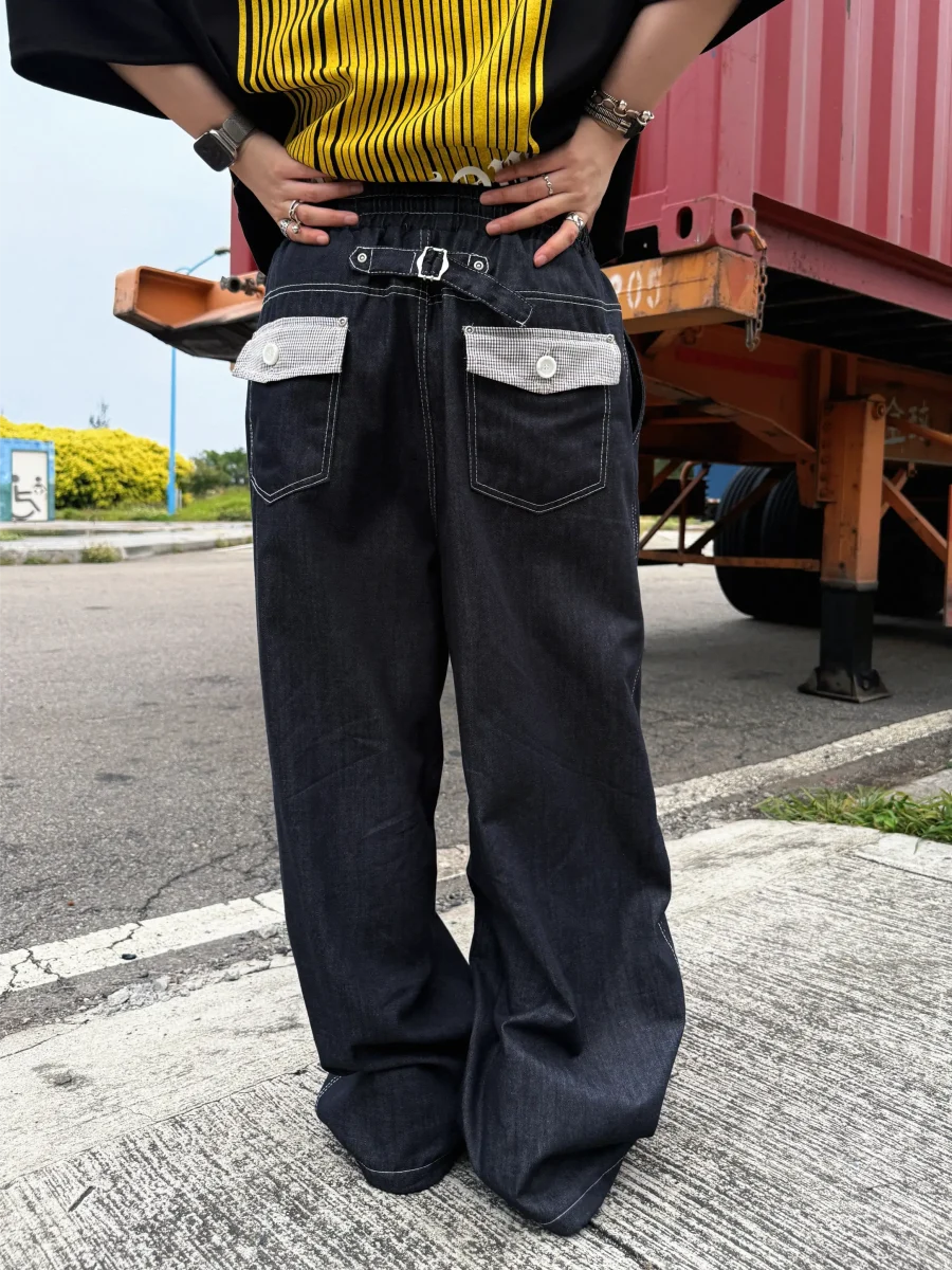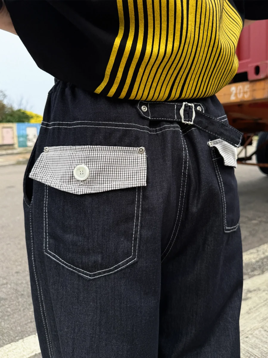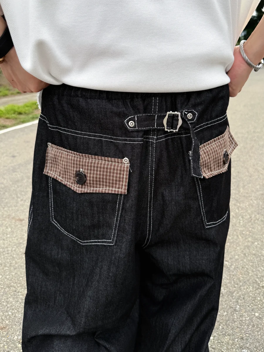 後口袋格紋牛仔長褲