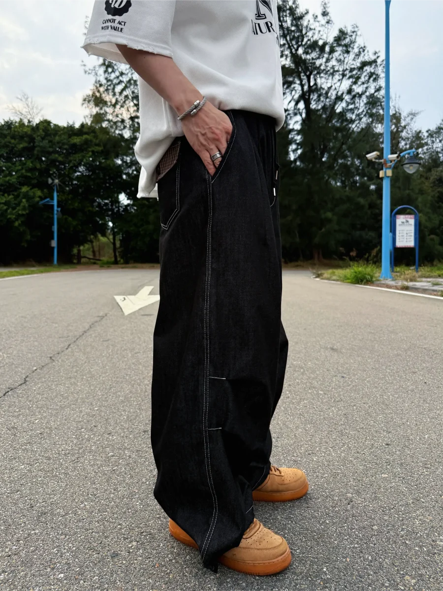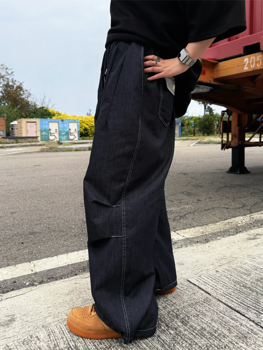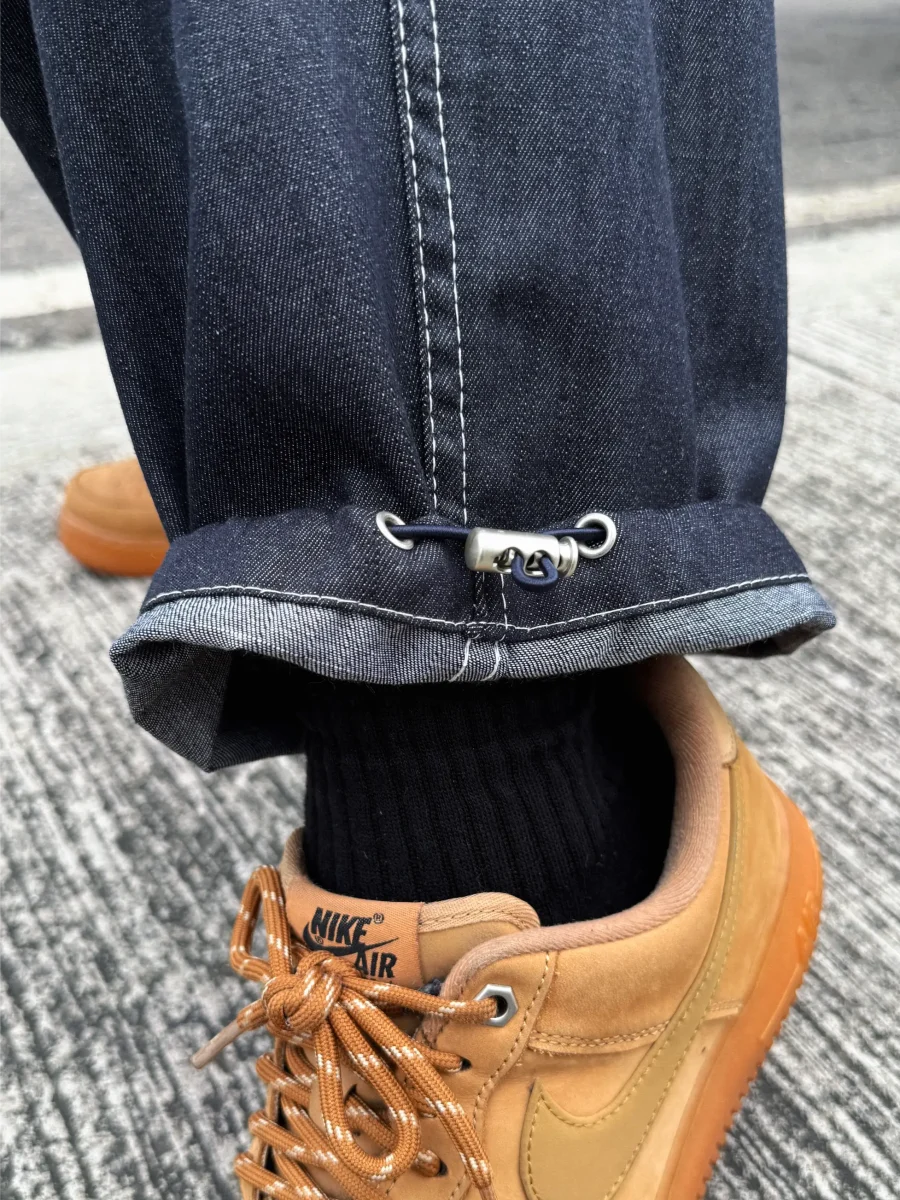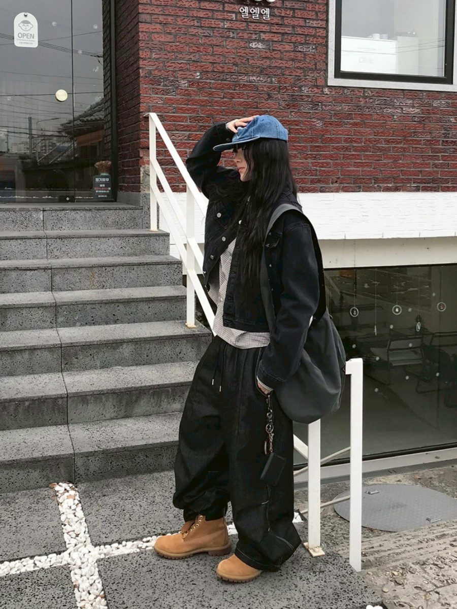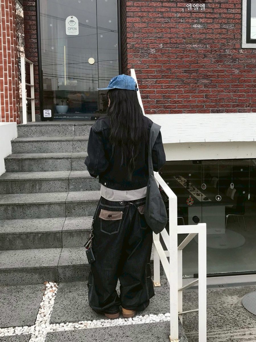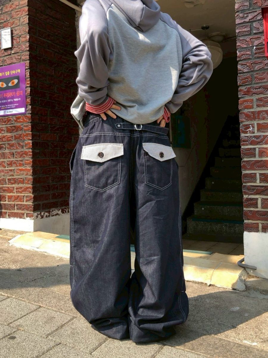 後口袋格紋牛仔長褲